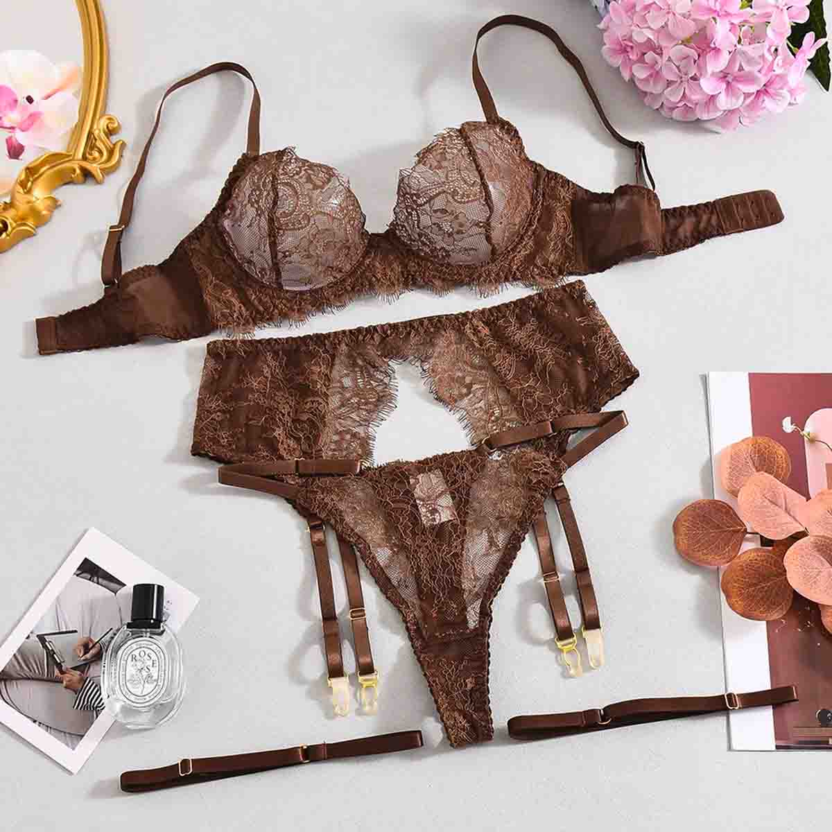 Chaque détail de notre Ensemble Lingerie Élégance est pensé pour évoquer le luxe et le raffinement. Fabriqué à partir de dentelle délicate, cet ensemble offre une texture douce au toucher, invitant à une expérience sensorielle inoubliable. La couleur café ajoute une touche de chaleur et de mystère, tandis que les accents rouges apportent une note audacieuse et passionnée. Les bonnets sculptés sont conçus pour soutenir et rehausser votre décolleté, tandis que les dessous harmonieux épousent vos hanches avec élégance.